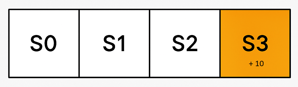 Let’s illustrate Q-learning with a minimal example. Consider an environment with 4 states in a straight line: S0, S1, S2, S3. The agent starts at S0, and the goal is to reach S3, which gives a reward of +10. All other actions give zero reward.