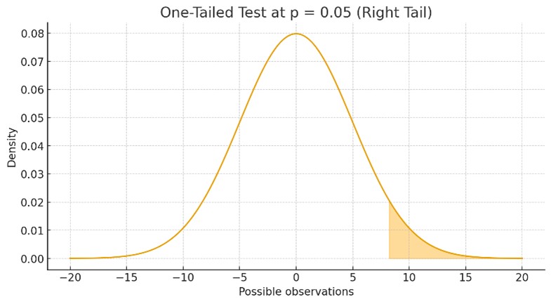 After calculating the p-value of our experiment, we compare it against a threshold, usually 0.05. A p-value of 0.05 means there is a 5% chance of observing results this extreme even if the null hypothesis is actually true. In other words, even when there is no real difference between the treatments, we would still expect to see results like these about 5% of the time purely by chance. By choosing 0.05 as our threshold, we are accepting a 5% false positive rate, a 5-in-100 chance of concluding that a change or treatment was effective when it actually was not. When talking about hypothesis tests, there are two ways to evaluate an alternative hypothesis. We can test whether version B is simply different from version A (a two-tailed test) or whether version B is specifically better or worse than A (a one-tailed test). The difference between these approaches becomes much easier to see when looking at the graphics below